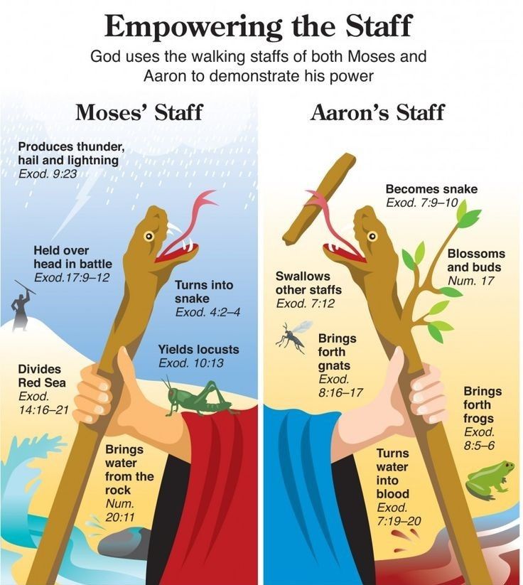 The answer. God does, and God’s power is revealed through many mysterious ways, including Aaron’s staff. It’s not the first time Moses’ or Aaron’s staff has been used. In fact, Exodus was full of references to either of them. The graph above gives us a quick reminder. But of course, one image can’t even begin to depict the splendor that Moses must have seen as he walked into the Tabernacle to find a dead piece of wood, sprouting to bud, and bearing fruit. Indeed, God is good!